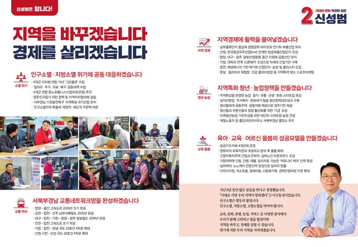 이날 신 후보는 인구·교통·경제·청년·교육 5대 목표와 30대 중점 추진과제를 제시하며 지역의 변화와 대한민국의 혁신을 위해 “산청·함양·거창·합천 4개 군이 먹고 살아갈 미래산업을 반드시 유치하겠다”고 밝혔다.