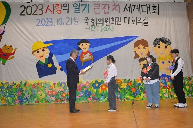 2023 사랑의 일기 큰잔치 세계 대회에는 전국 및 해외에서 18,000여 명이 응모하였으며 그 중에서 부총리겸교육부장관상 수상자로 선정된 벤자민인성영재학교 중등부 3학년 조이현을 비롯하여 1607명을 수상자로 선정하여 지난 16일 수상 내용을 홈페이지를 통해 발표하였고 수상자를 대상으로 시상식 참석 신청을 접수하여 최종 145명의 수상자와 가족이 함께 사랑의 일기 큰잔치 세계 대회 시상식에 참석하게 되었다.