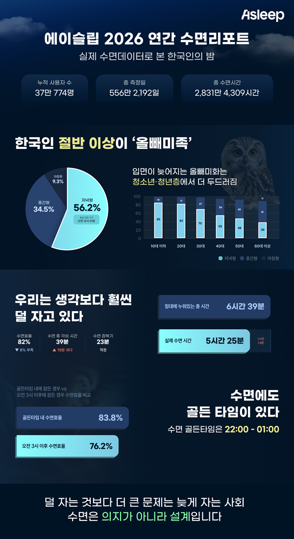 슬립테크 기업 에이슬립(대표 이동헌)은 ‘2026 대한민국 수면 리포트’를 발표하고 약 2년간 수집한 실제 수면 데이터를 분석한 결과를 공개했다. 이번 분석은 2024년 1월부터 2025년 12월까지 수집된 데이터를 기반으로 진행됐다.