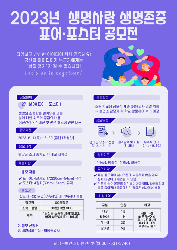 전문가 심사를 거쳐 대상 등 9개 작품을 선정해 상장을 수여한다. 수상작은 9월 10일 세계 자살예방의 날을 기념해 해남문화예술회관 1층 로비에 9월 한 달 간 전시할 예정이다.