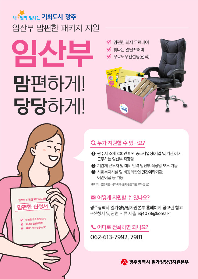 ‘빛나는 임산부 맘편한 패키지’는 지역 사회적 기업이 제작한 임신부 체형에 맞춰 접이조절이 가능한 임산부 전용의자 무료 대여, 임산부의 직장생활에 필요한 빛나는 열달꾸러미 제공, 근무환경 개선을 위한 모·부성 노무 상담 등 3개 분야를 종합 지원한다.