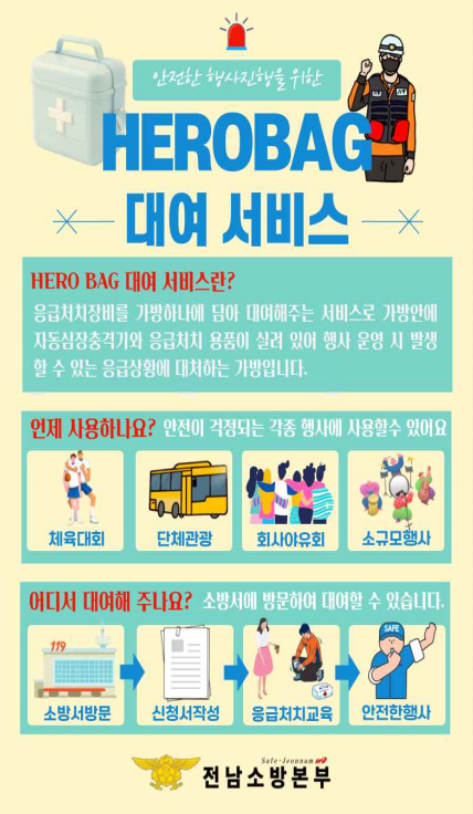 ‘HERO BAG 대여 서비스’는 행사를 주최하는 단체 및 기관에서 응급처치 장비 대여로 자체 안전확보 및 행사장에서 발생할 수 있는 응급상황에 신속하게 대응하기 위해 운영한다.