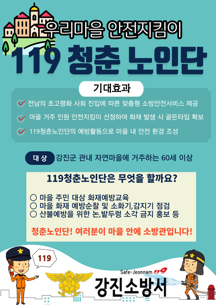 119청춘노인단은 전라남도의 초고령화 사회 진입에 따른 맞춤형 소방안전서비스를 제공하고 마을 거주 인원 안전지킴이를 선정해 화재 발생 시 골든타임을 확보해 마을 내 안전환경을 조성하기 위해 시행한다.