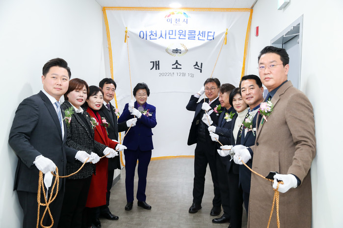 경기 이천시는 지난 1일 행정민원 서비스를 해소해주는 민원콜센터 정식 개소식을 갖고 본격 민원콜센터 상담서비스에 들어간다. 사진은 개소식에서 김경희 시장(가운데 왼쪽)이 관계자들과 현판식을 진행하는 모습.(사진제공=이천시청)