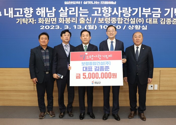 [해남=정찬남 기자] 전남 해남군 출향 기업인 김종준 보령종합건설(주)회장이 13일 고향 해남에 500만원을 기탁하며 3월 첫 최고액 기부를 실천했다.