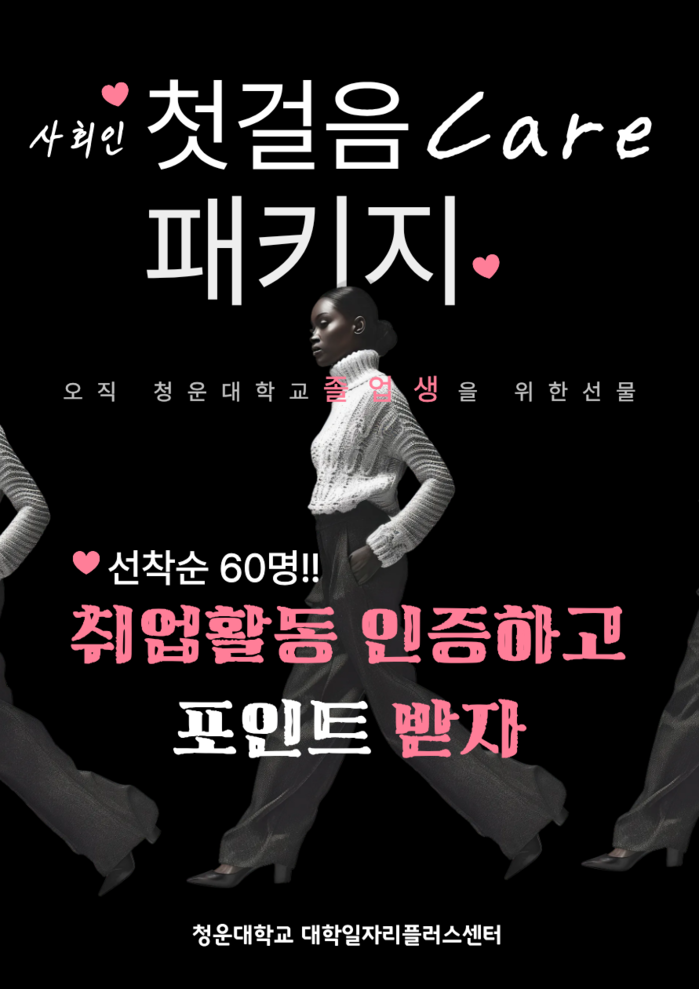 '사회인 첫걸음 케어 패키지'는 취업 또는 구직 활동을 인증하는 졸업생 선착순 60명에게 신입사원에 필요한 키트와, 청년정책 정보 등을 제공하고 구직중인 졸업생에게는 맞춤형 기업·직문 분석 자료를 제공하여 사회에 첫발을 내딛는 졸업생들에게 실질적인 격려와 응원을 보내는 것을 목표로 한다.