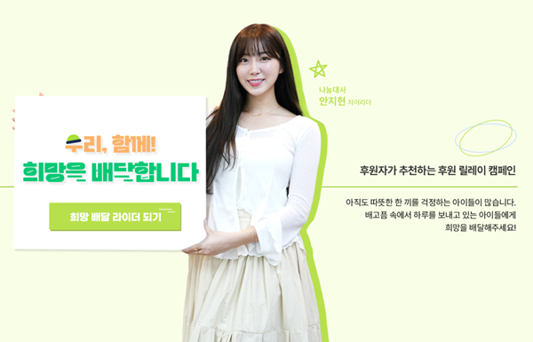 대한사회복지회 나눔대사 안지현 치어리더가 함께 하는 이번 캠페인은, 대한사회복지회 홈페이지를 통해 참여 가능하며 추천받지 않았더라도 누구나 후원 신청할 수 있다.