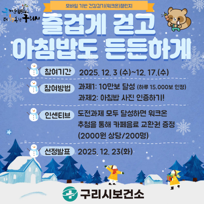 [구리=최광대 기자] 구리시(시장 백경현)는 시민들의 건강한 생활 습관 형성을 위해 ‘즐겁게 걷고, 아침밥도 든든하게’ 챌린지를 오는 12월 3일부터 17일까지 15일간 운영한다고 밝혔다.