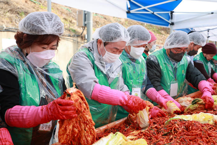 경기 남양주시 (사)남양주시새마을회는 최근 사흘간 ‘사랑의 김장 나누기’ 활동을 펼쳤다. 남녀새마을지도자들은 배추 등 김장 재료 수확부터 김장 전과정을 손수 작업해 5000여포기의 김장김치를 담갔다. 이 김장김치는 지역내 홀몸노인·차상위계층 가정 등 1200여가구에 전달될 예정이다. 사진은 주광덕 시장(왼쪽 두 번째)이 봉사자들과 함께 김장을 하고 있는 모습. (사진제공=남양주시청)