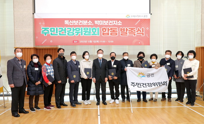 서울 금천구는 지난 1일 주민건강위원회 발족식을 개최해 박미보건지소 주민건강위원 5명과 독산보건분소 주민건강위원 8명에게 위촉장을 수여했다. 사진은 발족식에서 유성훈 구청장(가운데)이 관계자들과 기념촬영을 하는 모습.(사진제공=금천구청)