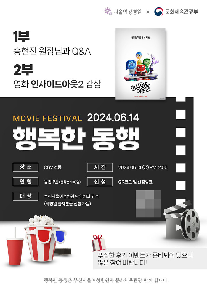 신청방법은 QR코드 혹은 신청링크를 통해 가능하며, 인원은 동반 1인까지 선착순 100명을 모집한다. 해당 행사는 서울여성병원과 문화체육관광이 함께한다.