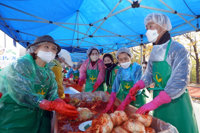 서울시 성북구가 주최하고 새마을부녀회가 주관하는 지역 대표 김장나눔 행사인 ‘2022 월동기 소외계층을 위한 사랑의 김장 나눔’이 지난 10일 개최됐다. 이날 150여명이 참여했으며, 김장 김치는 동절기를 앞두고 지역내 소외계층 700가구에 전달됐다. 사진은 이날 행사에서 이승로 구청장(오른쪽)이 봉사자들과 함께 김장을 하고 있는 모습. (사진제공=성북구청)