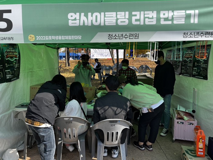 (재)김포시청소년재단 김포시청소년수련원은 최근 경기 김포한강중앙공원에서 ‘가족과 함께’라는 주제 아래 진행된 환경페스티벌을 열고 탄소중립·OX 퀴즈 등 다양한 체험부스를 선보였다. 사진은 환경페스티벌 참여자들이 업사이클링 리컵 만들기 체험을 하고 있는 모습. (사진제공=김포시청)