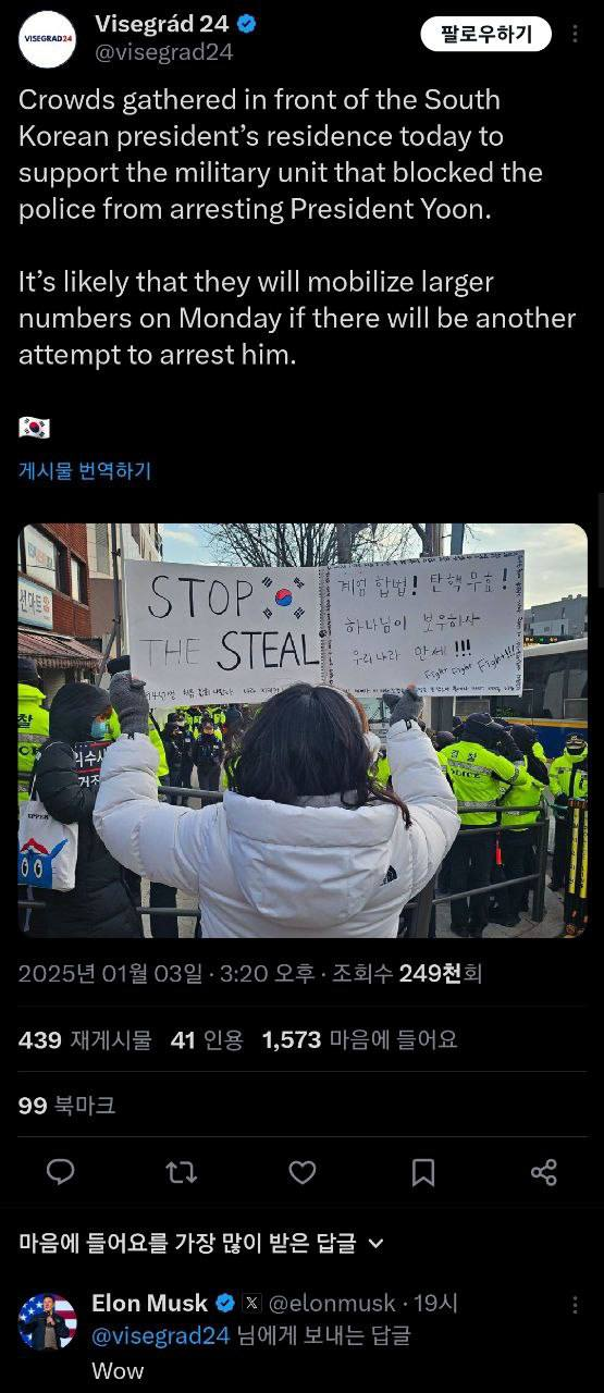실제 머스크는 전날 오후 8시 경, X의 저널리스트 그룹인 ‘비세그라드24’ X계정에 ‘계엄합법’ ‘탄핵무효’ 구호의 피킷을 든 여성의 뒷모습 사진에 "Wow" 댓글을 직접 달았다.