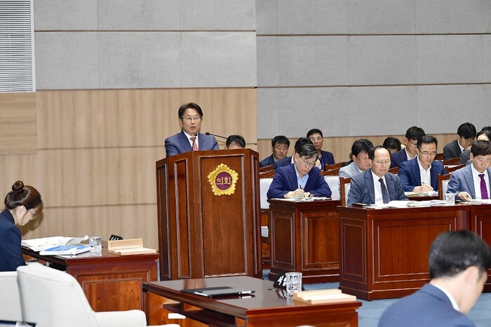 [광주=정찬남 기자] 강기정 광주광역시장이 5일 오전 시의회 본회의장에서 열린 제325회 제1차 정례회 시정질문에 참석해 시정현안에 대한 답변을 하고 있다. /광주광역시 제공