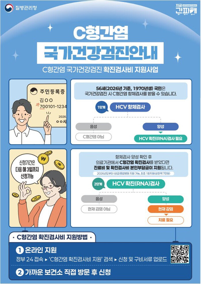 지원 대상은 올해 기준 56세(1970년생) 국가건강검진 수검자 중 C형간염 항체에 대한 양성 판정을 받고 확진 검사를 받은 시민으로, 확진 검사에 수반되는 진찰료와 검사비의 본인부담금을 최초 1회에 7만 원까지 지원받을 수 있다.