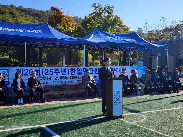 | ▲ 인천광역시중구축구협회가 주관한 ‘제20회 한·일 민간 축구대회’에서 이종호 의장이 축사를 하고 있다. (사진제공=인천중구의회) |