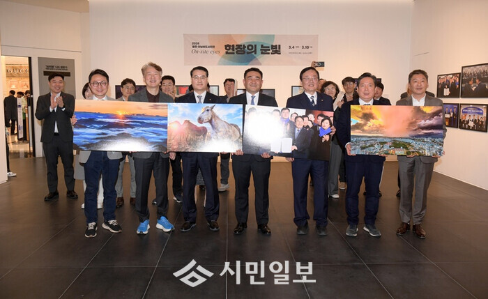 [광주=정찬남 기자] 김영문 광주광역시 문화경제부시장(앞줄 왼 쪽부터 세 번째)이 4일 광주신세계백화점 갤러리에서 열린 2026 광주·전남보도사진전 개막식에서 참석자들과 기념촬영을 하고 있다. /광주광역시 제공