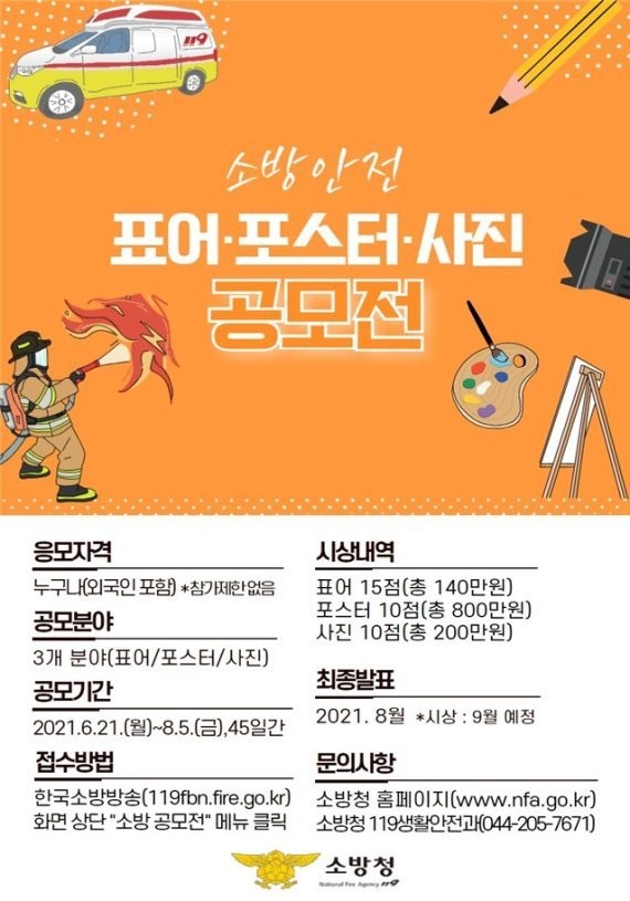 해남소방서 관계자는 “소방안전 관련 공모전을 통해 안전문화 확산 및 재난사고에 대한 경각심을 고취 시킬 수 있도록 많은 관심과 참여를 당부 드린다.” 고 전하며 자세한 사항은 소방청 또는 한국소방안전원 홈페이지를 통해 확인할 수 있다.