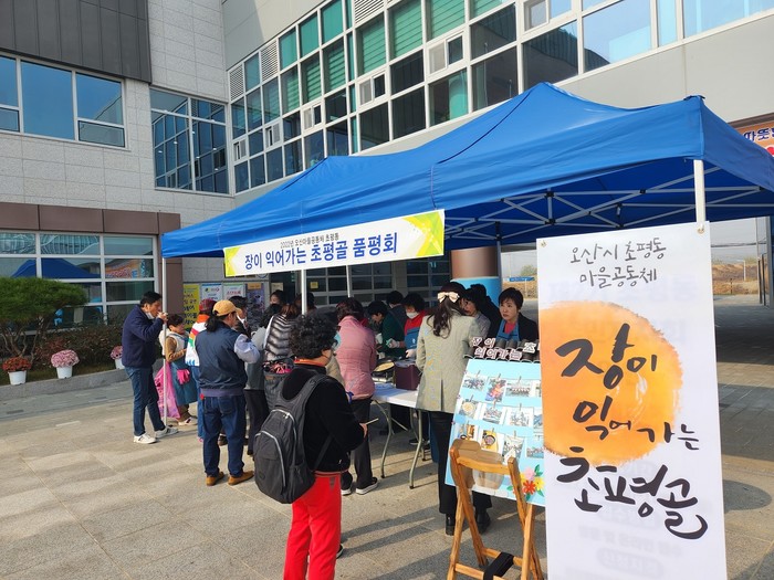경기 오산시 초평동이 최근 '장이 익어가는 초평골' 수제 전통장 품평회를 열었다. 이날 행사에서는 1년간 숙성시킨 수제 된장과 된장·고추장·밀가루와 함께 섞어 만든 장떡 시식 체험 등 홍보 부스를 운영했다. 사진은 이날 품평회가 진행되고 있는 모습. (사진제공=오산시청)