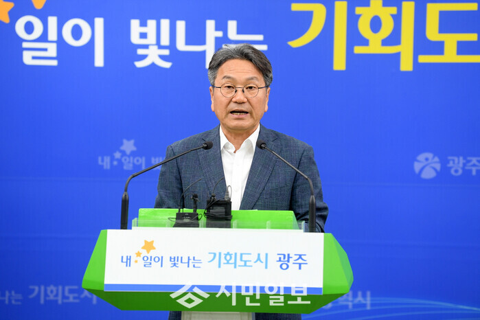 | ▲ 강기정 광주광역시장이 23일 오후 시청 브리핑실에서 민생회복 소비쿠폰 지급 관련 기자회견을 하고 있다. /광주광역시 제공 |