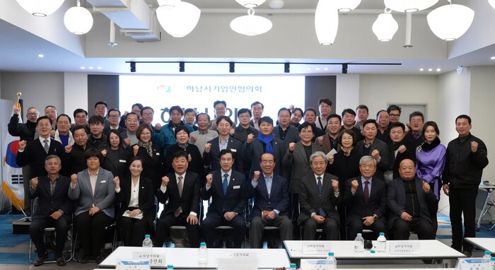 | ▲ 하남시의회는 최근 창우동 소재 벤처센터 미디어홀에서 (사)하남시기업인협의회와 간담회를 갖고 관내 기업 현안 해소를 위한 소통의 시간을 가졌다. 사진은 간담회 후 기념촬영을 하고 있는 참석자들의 모습. (사진=하남시의회 제공) |