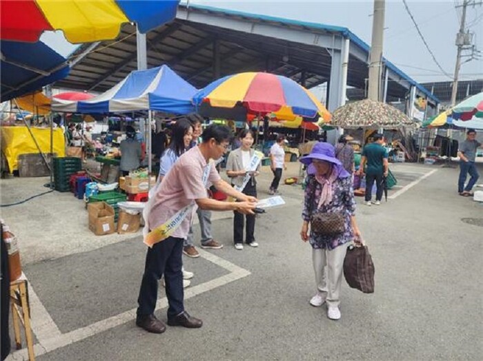 | ▲ 한국농어촌공사 해남·완도지사, 11일 해남읍 고도리 소재 5일 전통시장에서 지역민 대상, ‘농지이양 은퇴직불제’사업 추석 대목장 맞이 홍보 / 해남완도지사 제공 |