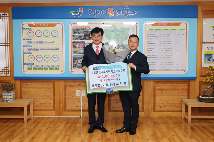 전남 (재)장흥군인재육성장학회는 지난 23일 세계항공여행사로부터 장흥군 인재 양성을 위한 장학금 200만원을 전달받았다. 사진은 전달식에서 김성 이사장(왼쪽)이 서영훈 대표와 기념촬영을 하는 모습. (사진제공=장흥군청)