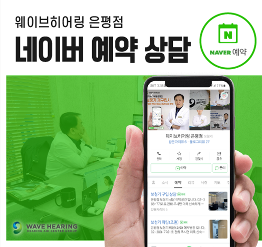 웨이브히어링 은평점 네이버 예약 이벤트 참여 방법은 네이버 검색창에 웨이브히어링 은평점 검색 후 모바일 기준 가장 상단에 보이는 네이버 예약 버튼을 클릭하여 원하는 시간대 선택과 상담 시 필요한 간단한 예약자 정보만 입력하면 된다. 예약 확정 문자가 가면 보청기 상담 내원시에 특별 할인을 제공받을 수 있다.