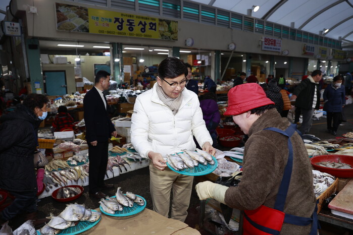 김철우 전남 보성군수가 2일 녹차골보성향토시장을 찾아 상인들의 애로사항을 청취하고, 소상공인을 격려하며 명절을 앞두고 민생경제를 살피고 있다. 사진은 이날 김 군수(오른쪽 두번째)가 생선을 구매하고 있는 모습.(사진=보성군청 제공)