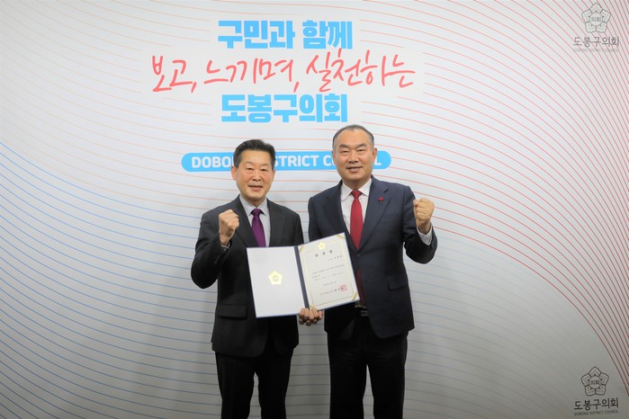 | ▲ 강신만 의장(오른쪽)이 신규 위촉된 이재범 법률고문과 기념촬영을 하고 있다. (사진=도봉구의회 제공) |
