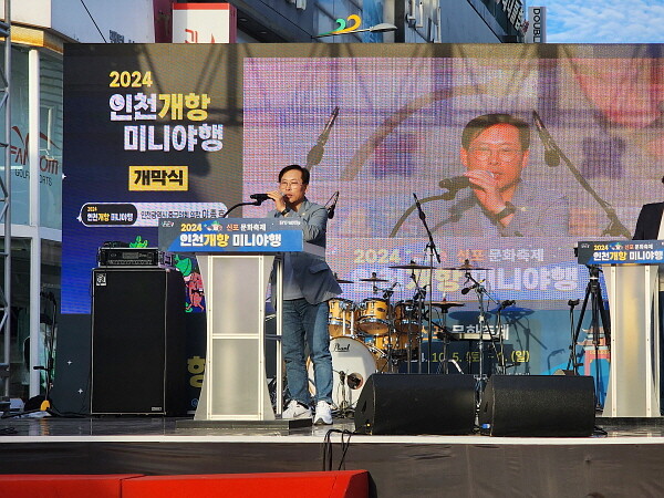 | ▲ 5일 중구 신포시장 일대에서 개최된 ‘인천개항 미니야행’에 참석한 이종호 의장이 축사를 하고 있다. (사진제공=인천중구의회) |