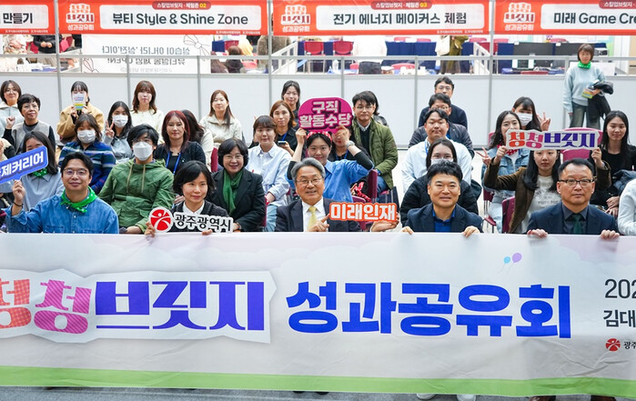 [광주=정찬남 기자] 강기정 광주광역시장(사진 앞줄 가운데)이 26일 오후 서구 김대중컨벤션센터에서 열린 광주 청년구직활동수당 지원사업 ‘2025 청청브릿지 성과공유회’에 참석해 청년들과 기념촬영을 하고 있다./광주광역시 제공