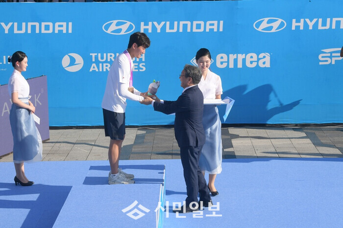 [광주=정찬남 기자] 강기정 광주광역시장이 11일 5·18민주광장 특설경기장에서 열린 '광주 2025 현대세계양궁선수권대회' 시상식에서 리커브 남자 개인전 3위를 차지한 김재덕 선수에게 축하를 하고 있다. /광주광역시 제공