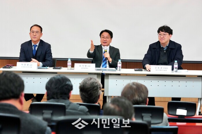 [광주=정찬남 기자] 강기정 광주광역시장이 24일 광주과학기술원에서 '광주전남통합 에너지산업분야 미래비전설명회'에 참석해 광주전남 통합의 추진상황과 지역 에너지 신산업 육성 전략 등에 대해 시민들과 대화를 나누고 있다. /광주광역시 제공