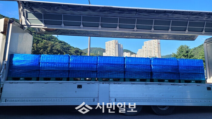 ▲ 광주광역시가 11일 극심한 가뭄으로 생활용수 확보에 어려움을 겪고 있는 강릉시에 생수를 추가 지원하기 위해 화물트럭에 빛여울수 1만병를 탑차하고 있다./ 자료사진 = 광주광역시 제공 |
