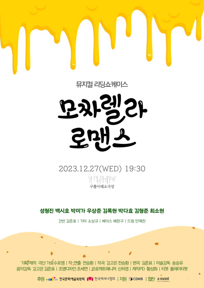 뮤지컬 리딩쇼케이스 <모짜렐라 로맨스>는 오는 27일 저녁 7시30분 구름아래소극장에서 진행한다고 밝혔다.