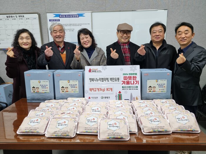 서울 중랑구 묵2동 행복나누리협의체가 지난 1일 저소득 홀몸노인들에게 설맞이 선물로 돼지고기를 전달했다. 행복나누리협의체 위원들은 노인들이 영양 불균형을 겪지 않도록 가정마다 돼지고기 1kg씩을 전달하고 안부를 챙겼다. 사진은 전달식에서 관계자들이 기념촬영을 하고 있는 모습.(사진=중랑구청 제공)