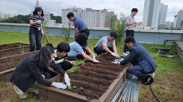 | ▲ 광주광역시청 공직자들이 옥상에 마련된 옥상텃밭을 가꾸고 있다. / 광주광역시 제공 |