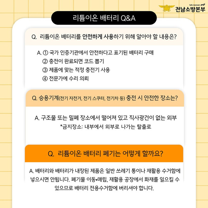 | ▲ 리퓸이온 배터리 안전한 사용법 안내 이미지 / 강진소방서 제공 |