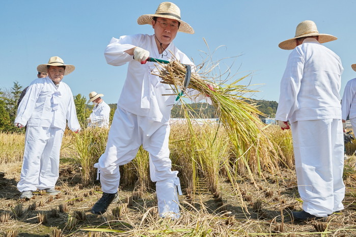 충남 (사)아산도농교류센터가 지난 20일 신정호 연꽃단지 일원 ‘에코 농(農) 파크’ 조성 예정지에서 무동력 전통 벼 베기 체험행사를 개최했다. 이날 행사에서는 낫으로 벼를 베고 탈곡기로 벼를 터는 전통 방식의 추수를 체험했다. 사진은 이날 박경귀 시장(가운데)이 전통 벼 베기 행사에 참여하고 있는 모습. (사진제공=아산시청)