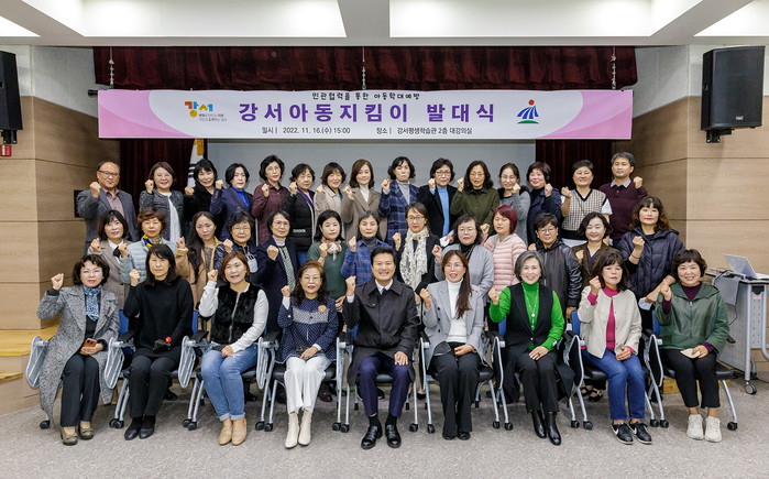 서울 강서구는 지난 16일 ‘강서아동지키미 발대식’을 개최하고 신규위원과 아동지키미에게 위촉장을 수여했다. 아동위원 49명으로 구성된 강서아동지키미는 아동살피기, 아동학대 의심사례 신고 등 아동복지 증진을 위한 활동을 하게 된다. 사진은 발대식에서 김태우 구청장(앞줄 가운데)이 아동위원들과 기념촬영을 하고 있는 모습.(사진제공=강서구청)
