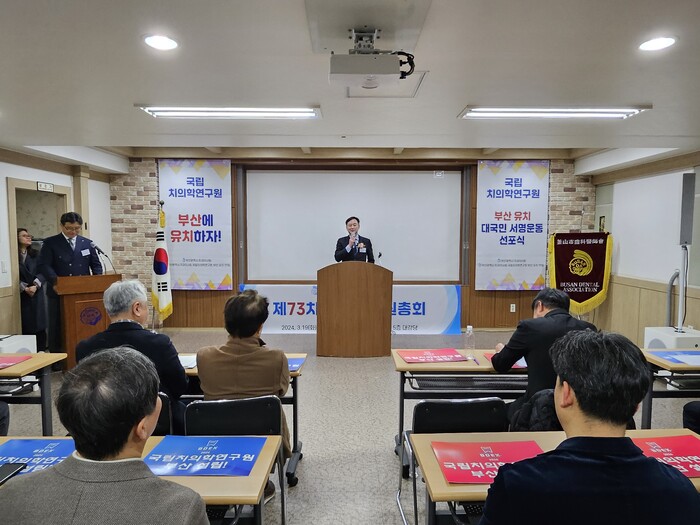 지난 제73차 부산광역시 치과의사회 정기대의원총회에서는 총회 시작 전 ‘국립치의학연구원 부산유치를 위한 대시민 서명운동 선포식’을 열고 한 목소리로 “국립치의학연구원 부산 설립”을 외쳤다.