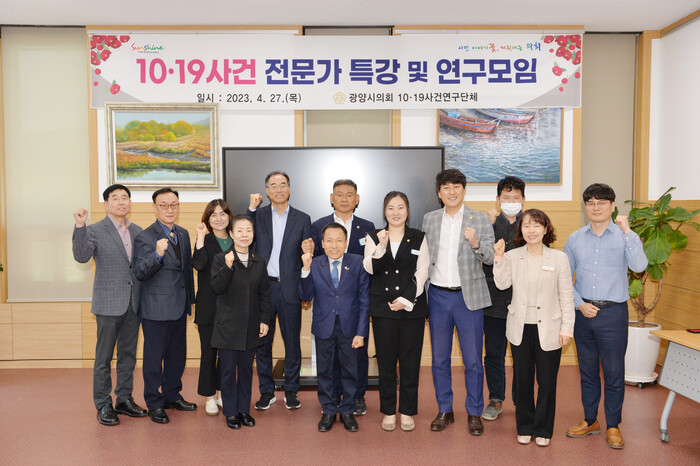 한편, ‘10.19사건 연구단체’는 지난 4월 3일 의회운영위원회 의결을 거쳐 구성되었으며, 올해 말까지 ▲광양지역 자료 조사를 통한 올바른 역사관 정립 ▲제도개선내용 발굴 ▲피해자ㆍ유족 명예회복 및 지원시책 강구 ▲시민 교육, 참여 및 연대 강화 시책 개발 등에 대해 연구를 진행할 예정이다.