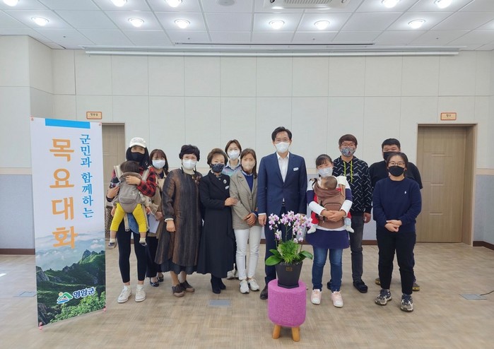 [영암=정찬남 기자] 우승희 영암군수가 지난 27일 영암군보건소에서 열린 9번 째 목요대화에 참석한 다자녀가정 부모와 지역아동센터관계자, 어린이집협회장 등 관련인 20여 명과 대화에 나섰다.