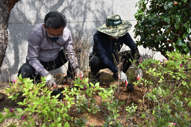 | ▲ 해남교육지원청 직원들이 청 내 화단에 꽃나무 식재 / 해남교육지원청 제공 |