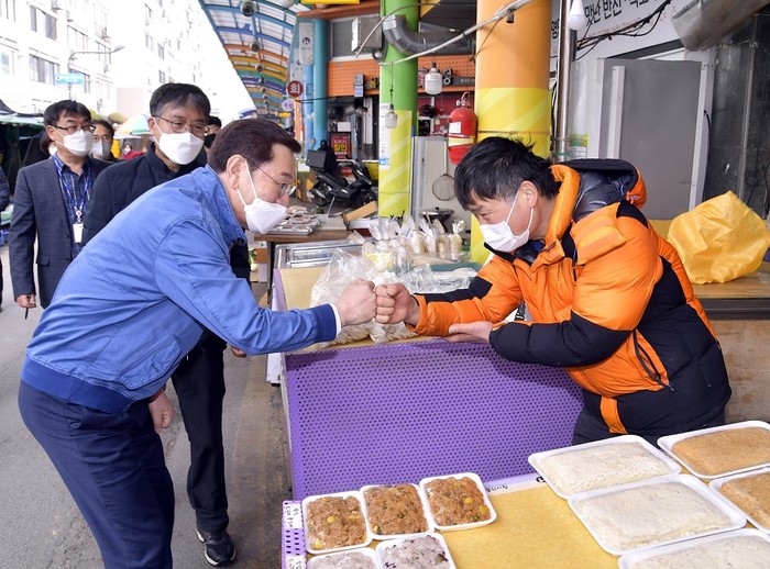 [광주=정찬남 기자] 이용섭 광주광역시장은 23일 오후 남구 봉선시장을 방문해 코로나19로 어려움을 겪고 있는 시장 상인들을 격려하고 애로사항을 청취했다./광주광역시 제공