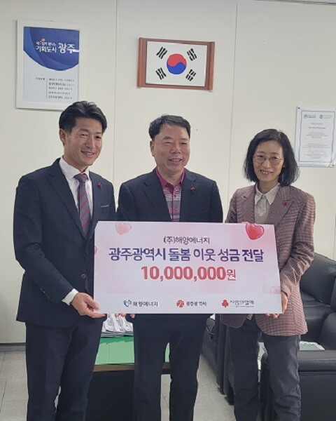 광주광역시(시장 강기정)는 21일 시청에서 정영화 광주시 복지건강국장, 정회 ㈜해양에너지 대표이사, 김진곤 광주사회복지공동모금회 사무처장 등이 참석한 가운데 돌봄이웃 성금 전달식을 가졌다.