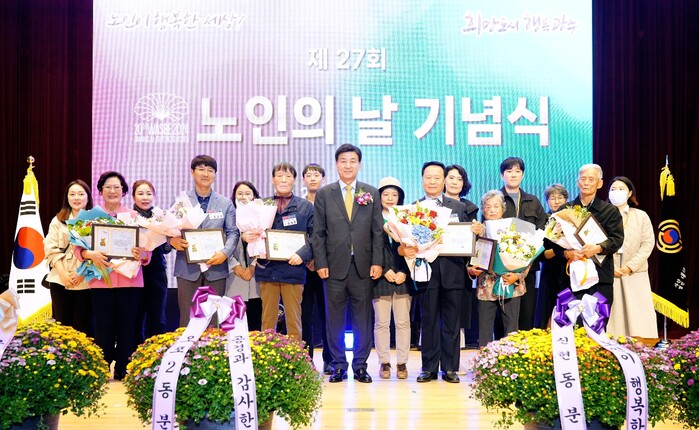 경기 광주시와 (사)대한노인회 광주시지회는 지난 5일 제27회 노인의 날을 맞아 기념식을 개최했다. ‘노인이 행복한 세상’을 주제로 한 샌드아트 공연, 초청가수 김다나 공연 등 지역내 노인 1000여명을 초대해 감사의 마음을 전했다. 사진은 방세환 시장(가운데)이 노인복지 유공자들과 기념촬영을 하고 있는 모습.(사진=광주시청 제공)