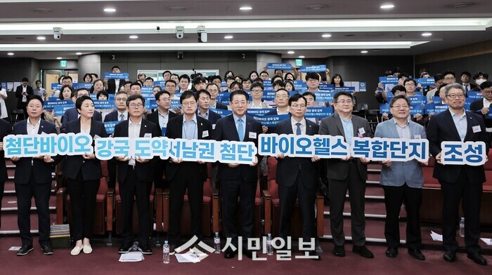 이날 포럼에서 참석자들은 “첨단바이오 강국 도약! 서남권 첨단 바이오헬스복합단지 조성” 구호를 외치며 지역 간 상생 협력과 바이오헬스 국가균형발전의 결의를 다졌다. /광주광역시 제공